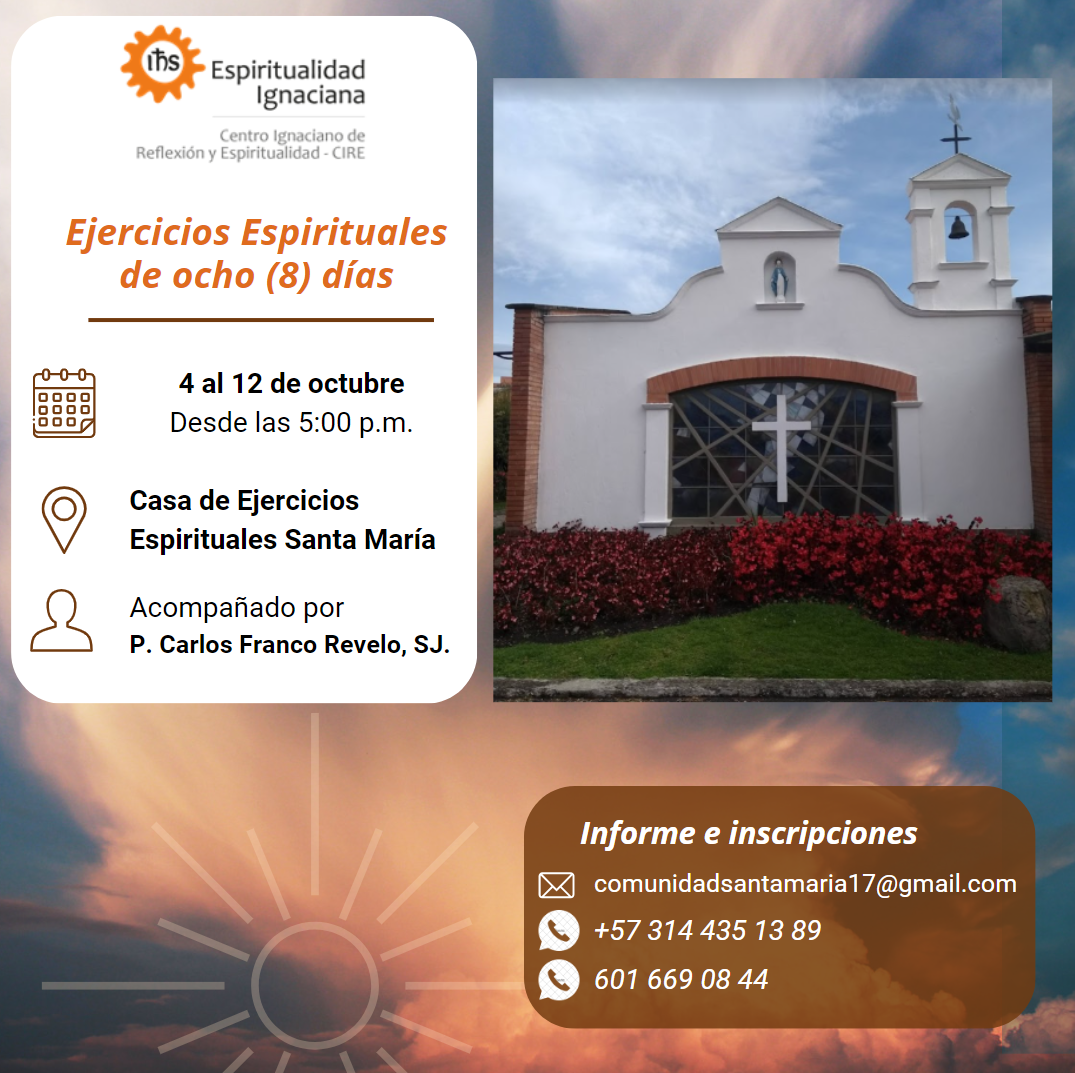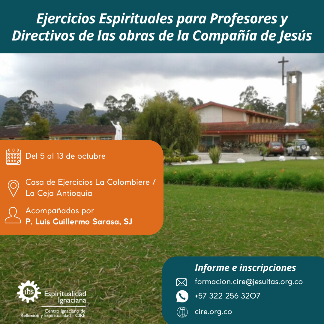 Tanda de Ejercicios Espirituales de San Ignacio de Loyola para profesores y directivos de las obras de la Compañía de Jesús Acompaña: P. Luis Guillermo Sarasa Gallego, SJ. Lugar: Casa de Ejercicios La Colombiere / La Ceja Antioquia Para mayor información: formacion.cire@jesuitas.org.co WhatsApp: +57 322 256 32 07