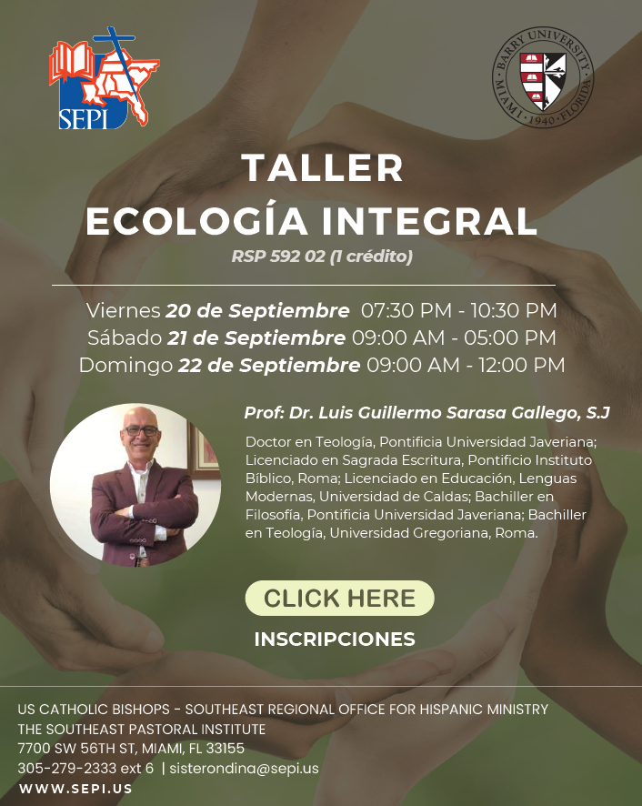 Viernes 20 de septiembre 7:30 p.m. - 10:30 p.m. Sábado 21 de septiembre 9:00 a.m. - 5:00 p.m. Domingo: 9:00 a.m. - 12:00 p.m. Taller Ecología Integral Lugar: (SEPI) Instituto Pastoral del sureste - Miami Profesor: P. Luis Guillermo Sarasa, SJ