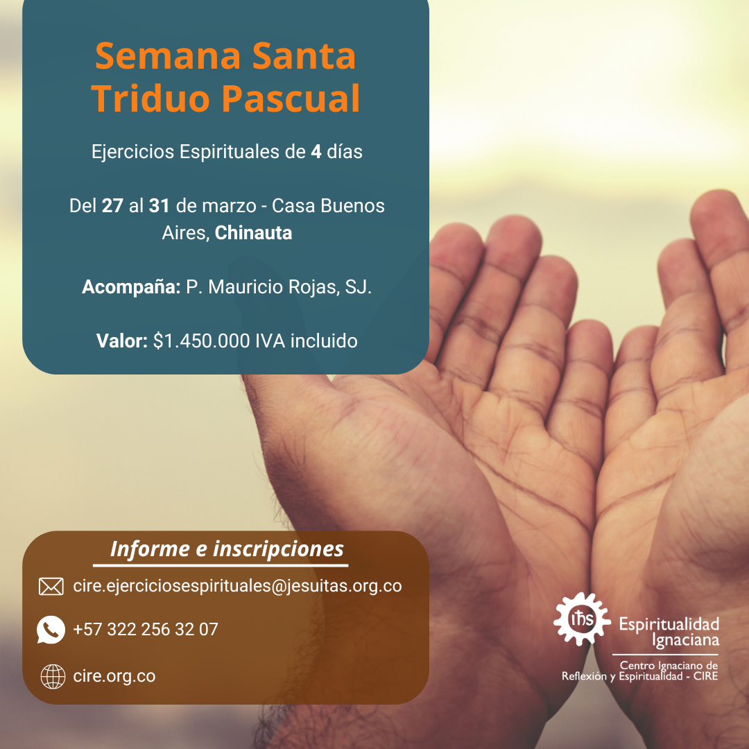 Ejercicios Espirituales de Triduo Pascual en Chinauta (Cundinamarca): Triduo: desde el 27 al - 31 de marzo. Costo: COP $ 1.450.000.oo - Inversión incluye transporte desde el CIRE Chapinero Hora de salida 1pm desde las instalaciones del CIRE (Cr 10 # 65 - 48 Barrio Chapinero) Lugar: Casa Buenos Aires, en Chinauta (Cundinamarca). Acompañados por el […]