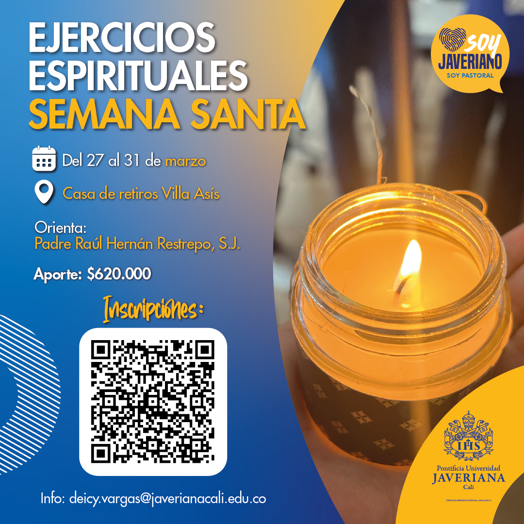 Ejercicios Espirituales de 4 días - Semana Santa Horario y ubicación 27 de mar de 2024, 5:30 p. m. – 31 de mar de 2024, 3:30 p. m. Villa Asís - Jamundí, Valle del Cauca. Inversión: $620.000.oo IVA Incluido