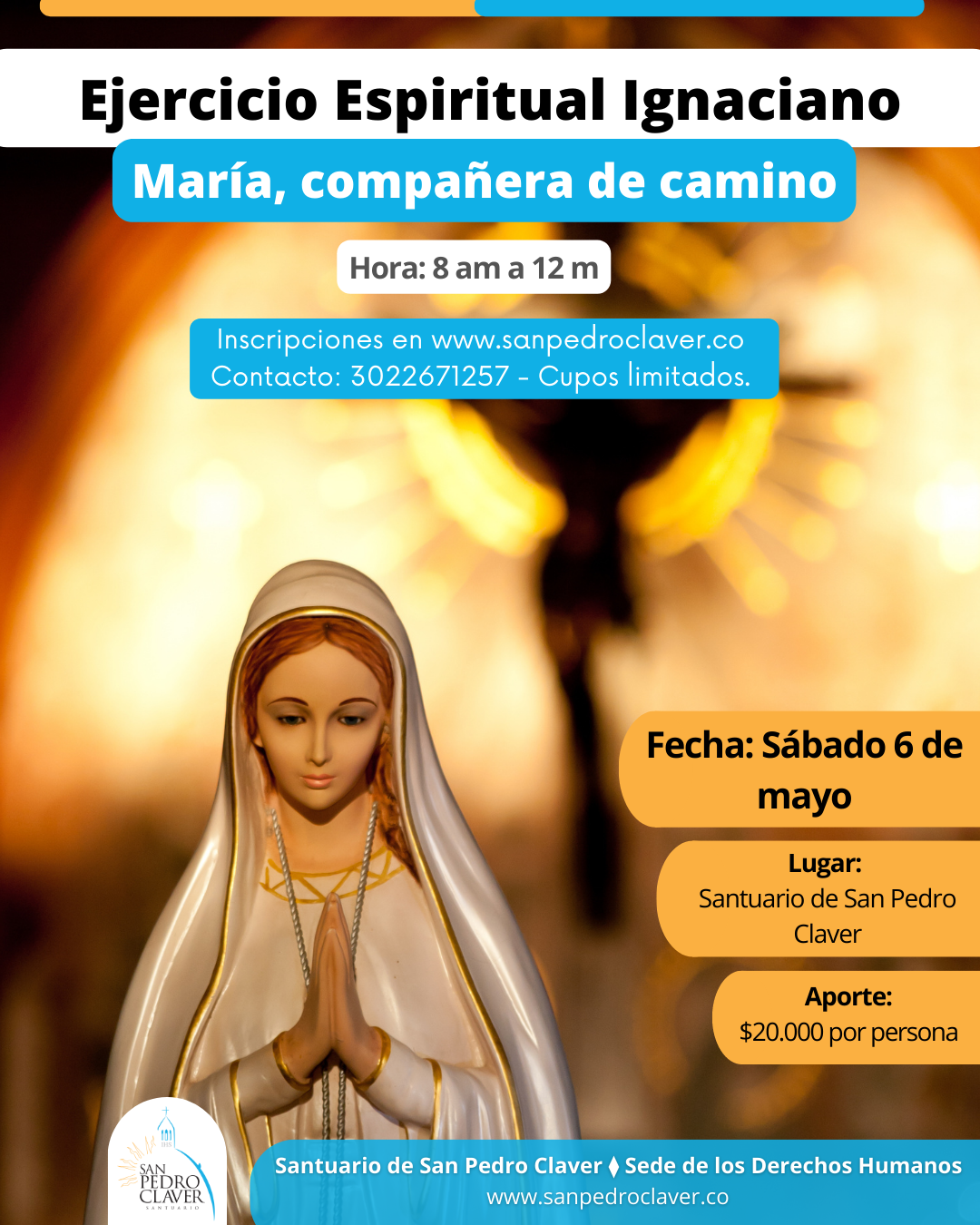 Experiencia de Ejercicio Espiritual Ignaciano: "María, compañera de camino". Lugar: Santuario San Pedro Claver, Cartagena de Indias. Acompaña P. Luis Raúl Cruz, S.J. Hora: 8:00 am a 12:00 m Aporte por persona: COP $20.000 Los cupos son limitados. Diligencia aquí tu inscripción